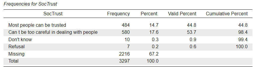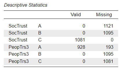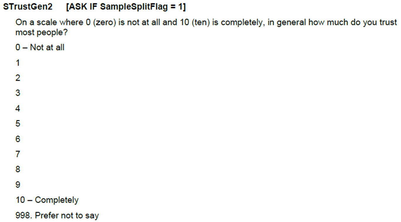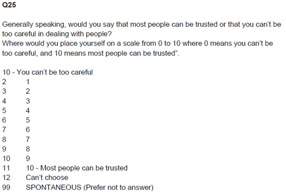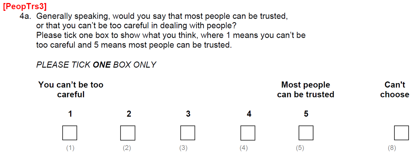 In the exercises below, we return to some of the small individual-level datasets we used in Workshop 1 and 2, which contain selected variables from the British Social Attitudes Survey, the Citizenship Survey and the Community Life Survey (find them under the Questions of Trust tab on the Data page).
