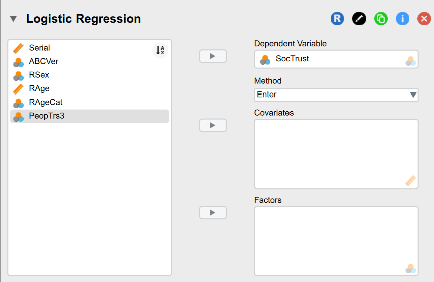 If your chosen outcome variable is categorical with more than two categories but fewer than at least seven, you will have to dichotomise it in order to use it as a dependent variable in a logistic regression. While there are specific modelling methods for “multinomial” type outcome variables, we are not covering them on this module.