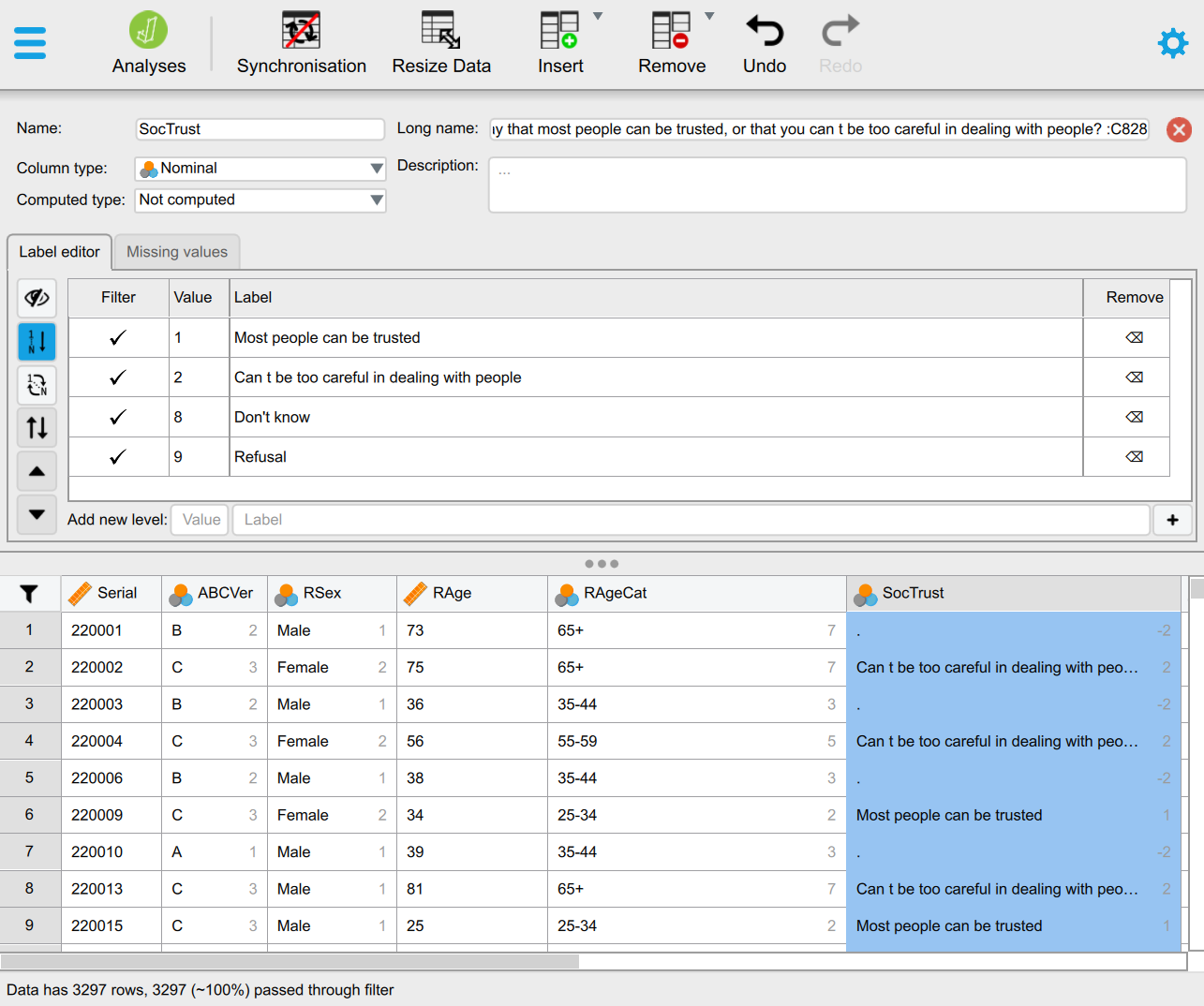 Identify and perform any required data cleaning and transformations (e.g. rename variables to more human-readable names, set additional missing values, label and recode categories, reverse, centre or standardise scales);